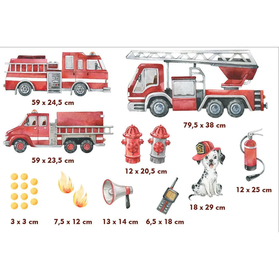 - Lieferumfang: Feuerwehrautos, süßer schwarz-weißer Dalmatiner, Hydranten und natürlich Feuerlöscher und Flammen, um dein Kinderzimmer zu verschönern.
