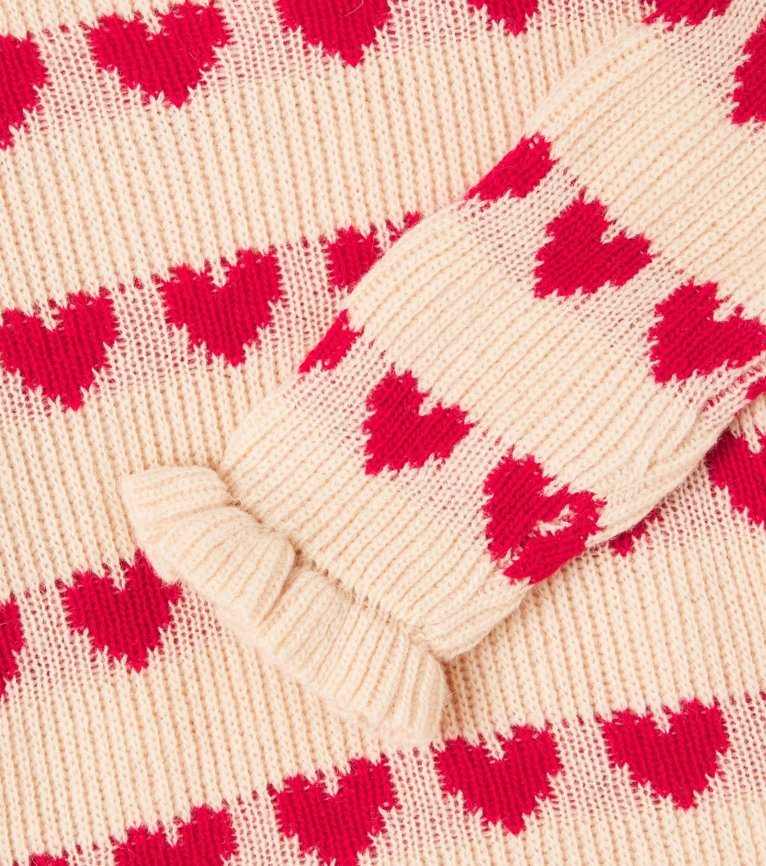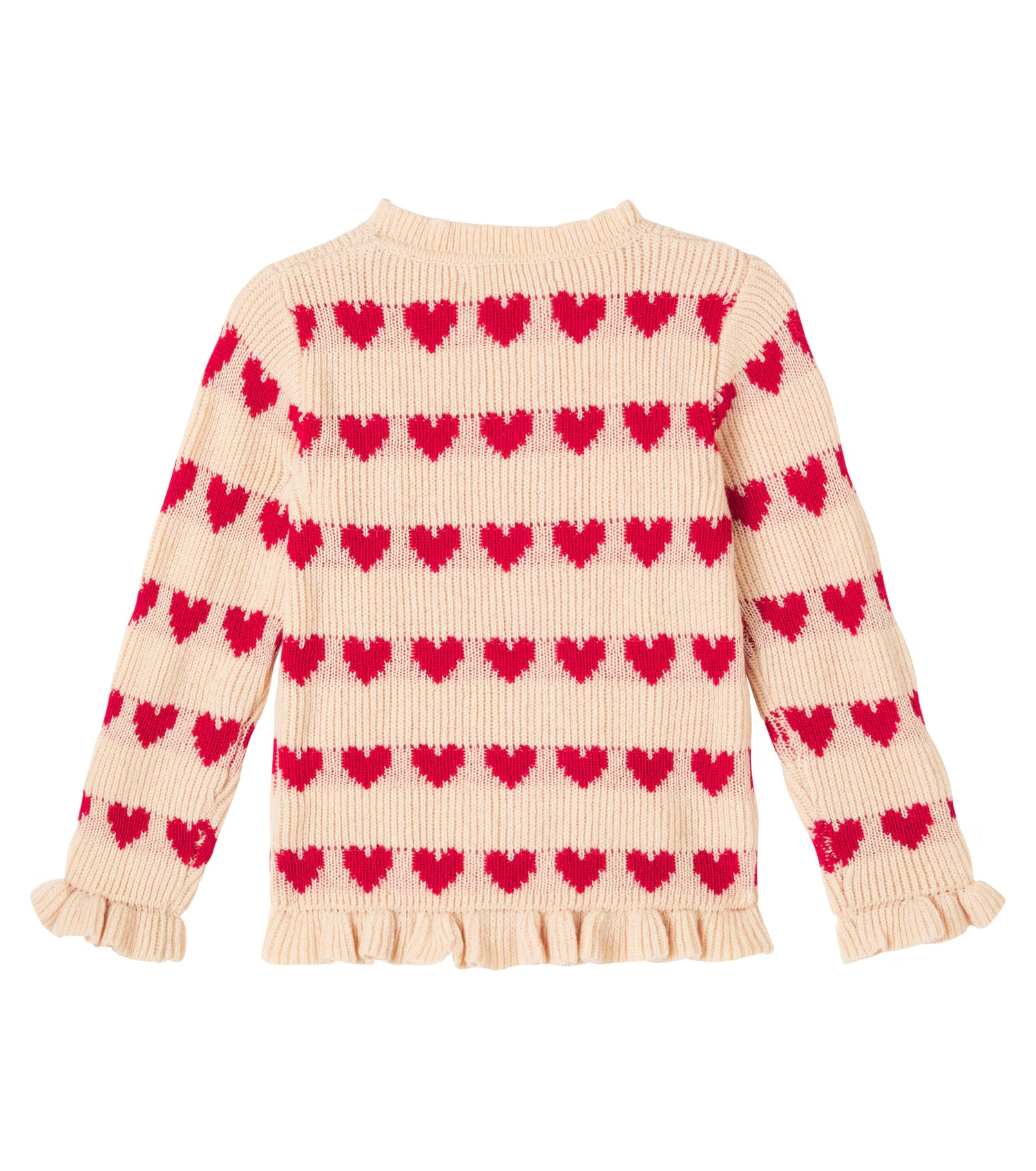 Kuscheliger Strickpullover aus weichem Wollmix mit liebevollem Herzmuster – für kleine und große Herzensbrecher. Der Laula Sweater hält angenehm warm, ohne zu kratzen, und ist damit perfekt für kalte Tage. Rüschen am Halsausschnitt und an den Ärmelbündchen verleihen ihm einen verspielten, hochwertigen Look. Ob festlich kombiniert oder gemütlich zu Jeans, dieser Pullover bringt Wärme und Stil in die Garderobe Ihres Kindes.
