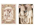 Eine doppelte Portion königlicher Spielspaß: Die Königlichen Zwillingsmäuse (kleine Schwester & kleiner Bruder) begeistern als Prinzessin und Prinz im Mini-Format. Beide tragen goldene Kronen und wunderschöne königliche Gewänder, die abnehmbar sind. Zum Set gehört eine liebevoll dekorierte Streichholzschachtel als Schlossbett, komplett mit der weichsten Bettwäsche, in der die Zwillinge Seite an Seite schlummern. Dieses Maileg-Set lädt Kinder ein, eigene Märchen zu erfinden – vom Ball im Mäuseschloss bis zum gemeinsamen Einschlafritual der royalen Geschwister. Ideal, um die Maileg-Welt um einen Hauch von Magie und Adel zu erweitern.