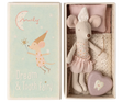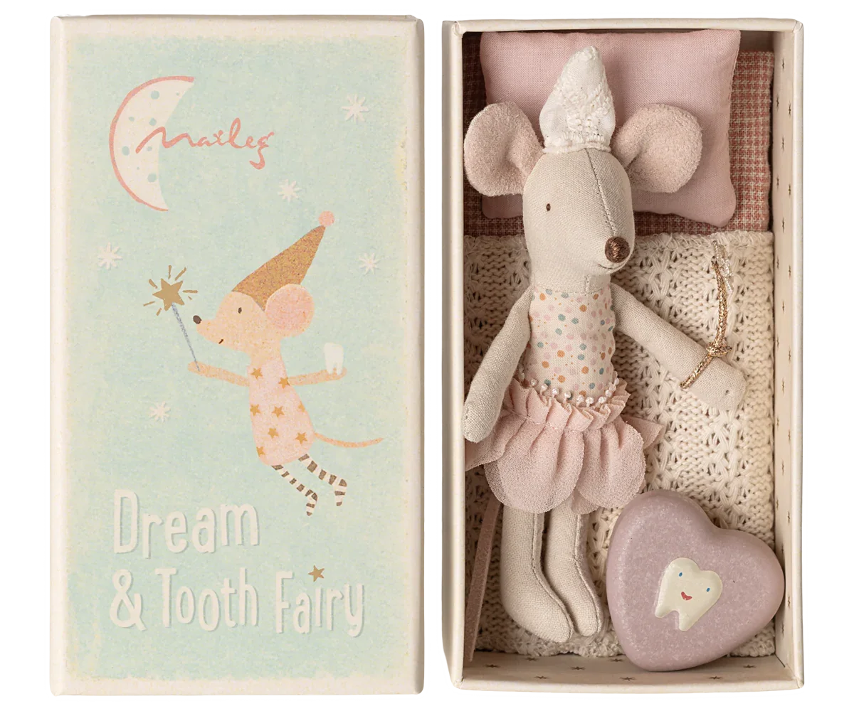 • Lieferumfang: 1 Maileg Zahnfee-Maus (Kleine Schwester) mit Kleid, Hut, Flügeln (fest vernäht) und Zauberstab; 1 goldene Zahndose (Metall); 1 Streichholzschachtel mit Bettzeug (Matratze, Kissen, Decke)