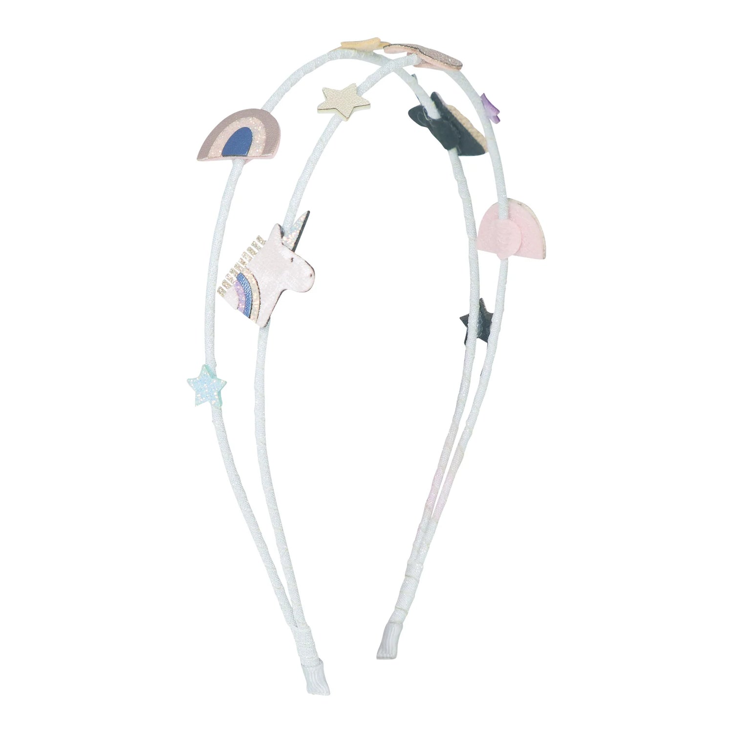 Doppelt zauberhaft: Zwei schmale, bandummantelte Haarreifen mit Einhorn-, Regenbogen-, Stern- & Herz-Details runden Pastell-Looks ab – von Geburtstagsfeier bis Einschulung. Bequem, leicht und auf Kinderköpfe abgestimmt.